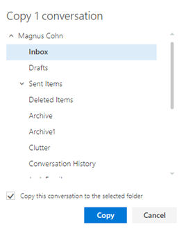 7. To copy the file, chose the folder, select Copy the conversation to the selected folder, and click Copy.